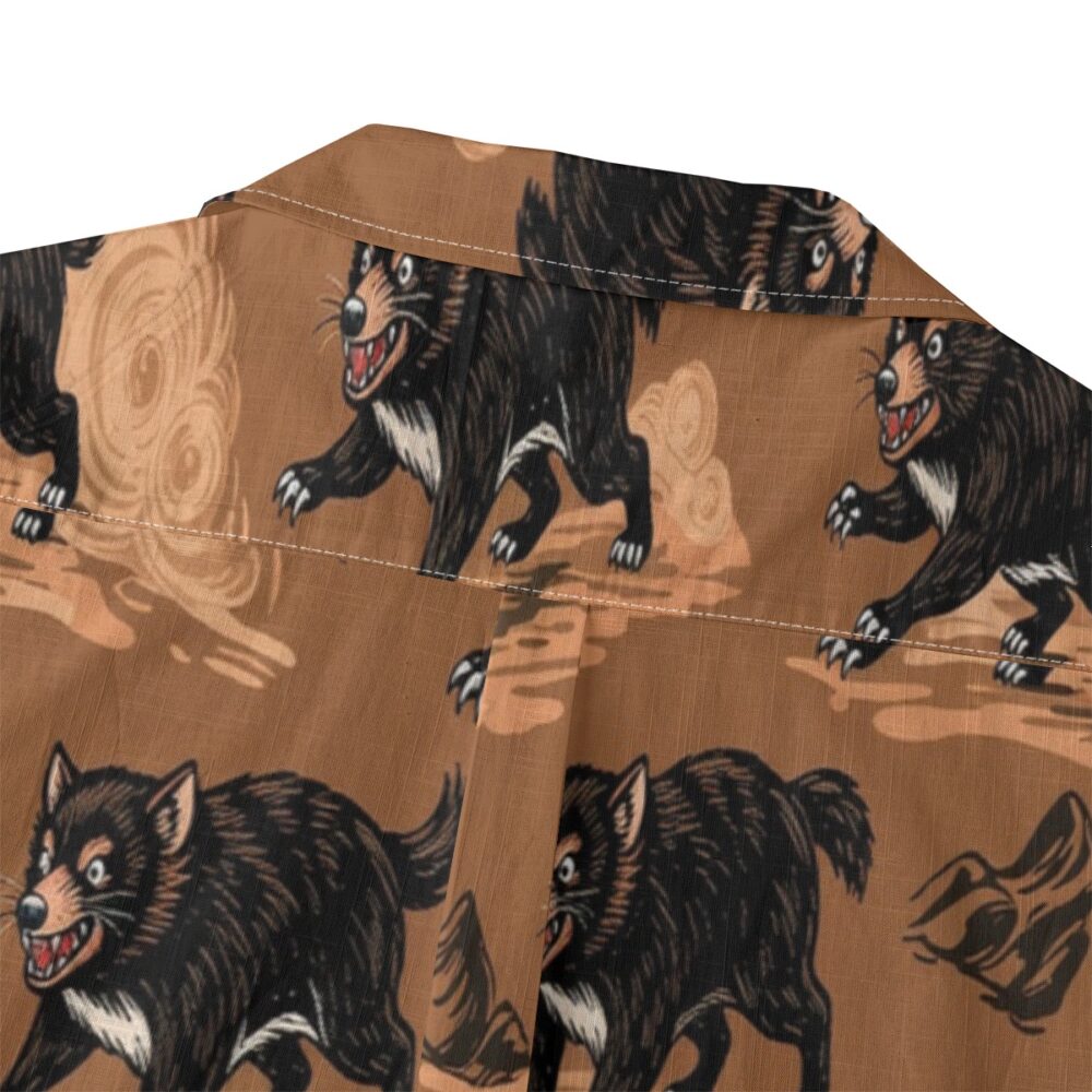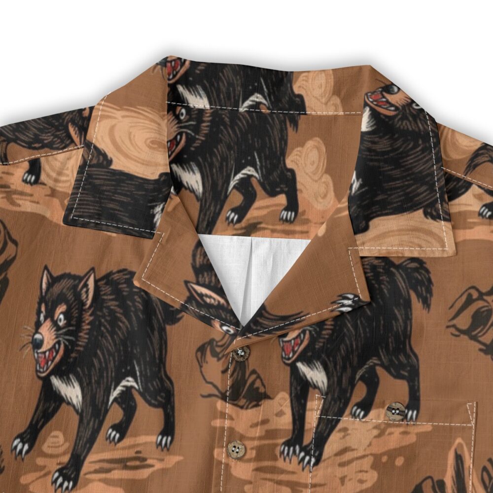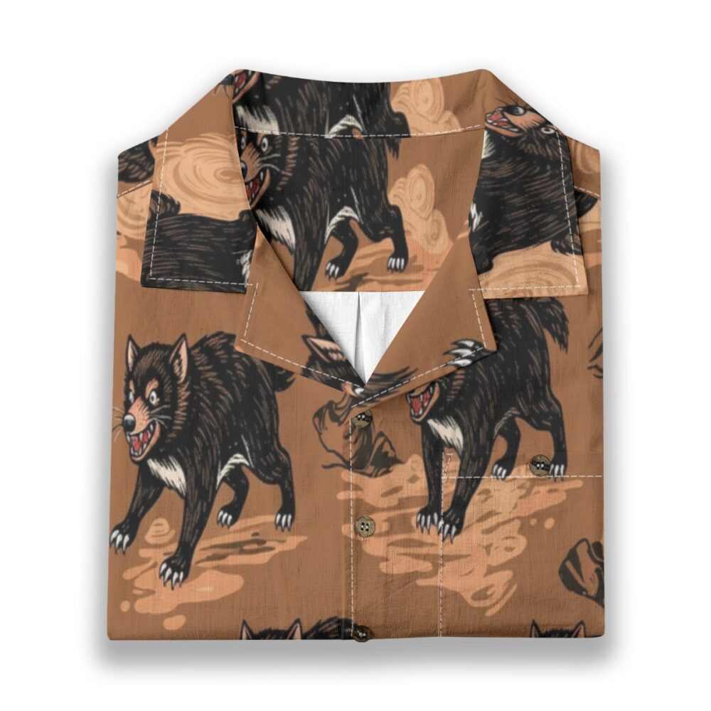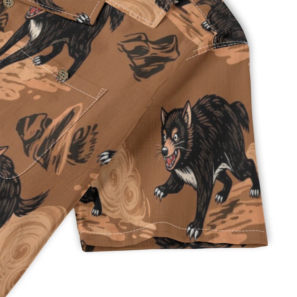 Bold Tasmanian devils appear among earthy textures, creating a rugged yet playful pattern with warm natural tones.